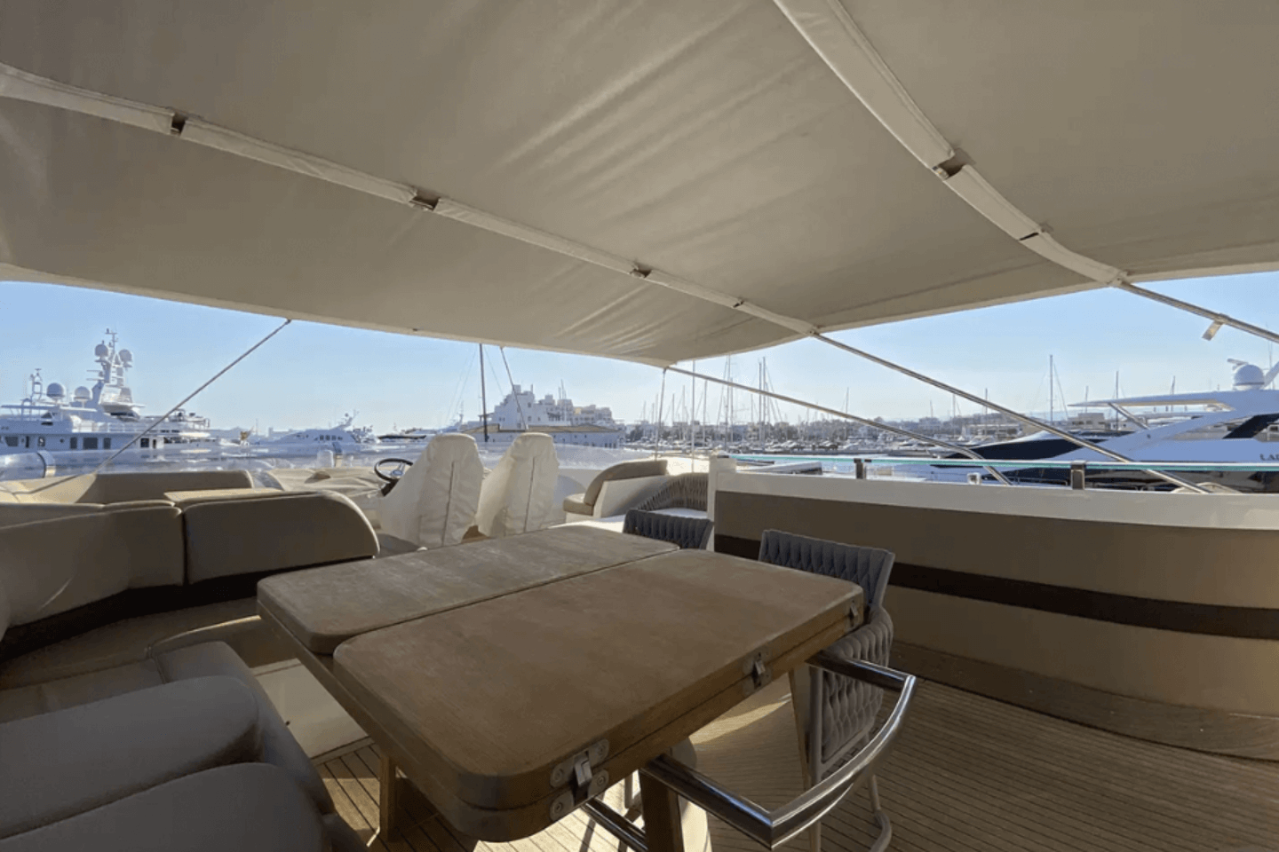 Inside, 4 sumptuous en-suite cabins sleepeight lucky guests in absolute comfort,while panoramic windows flood the salonwith natural light. The flybridge is a sunsoaked haven, boasting plush sunpads, awet bar, and plenty of space to entertain orunwind.