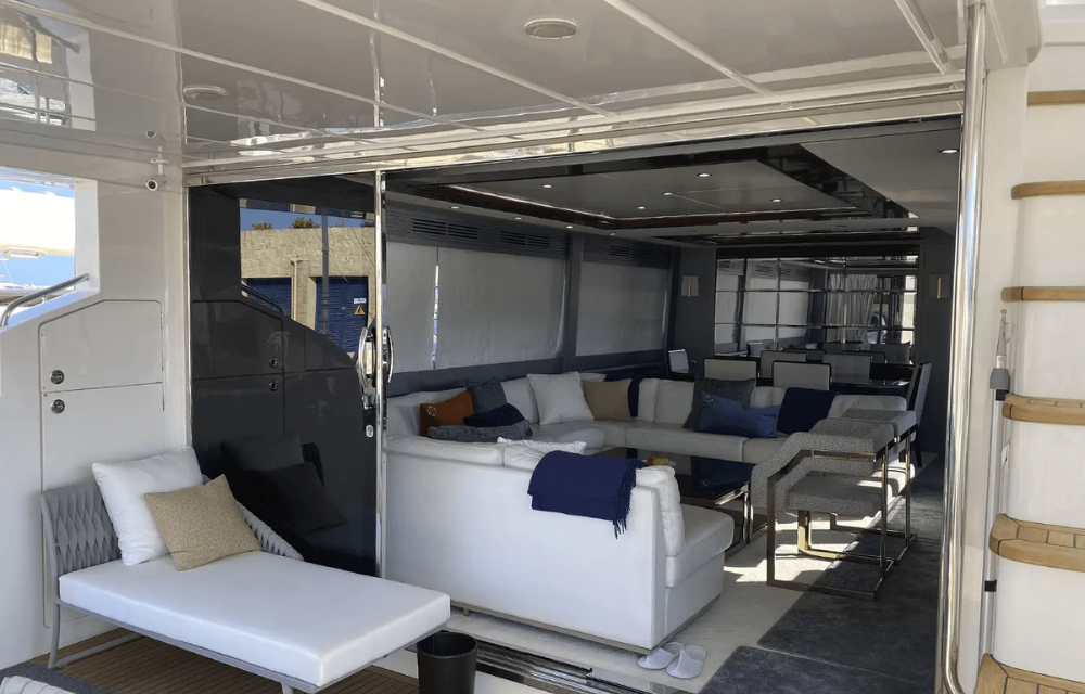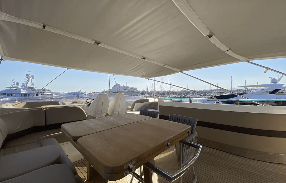 Inside, 4 sumptuous en-suite cabins sleepeight lucky guests in absolute comfort,while panoramic windows flood the salonwith natural light. The flybridge is a sunsoaked haven, boasting plush sunpads, awet bar, and plenty of space to entertain orunwind.