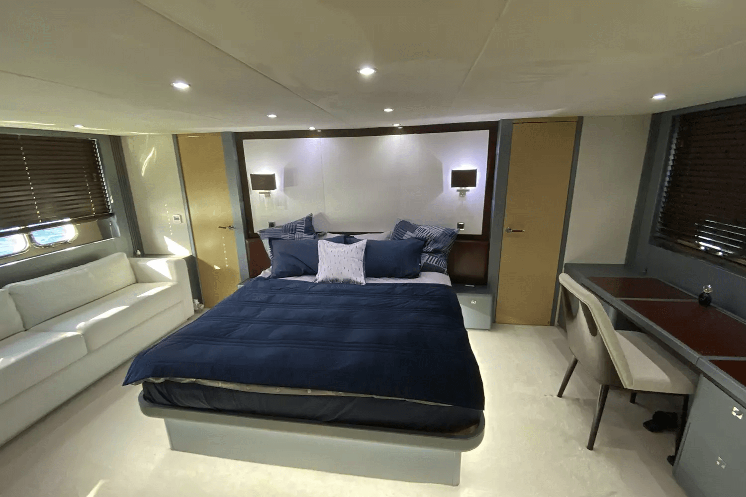 Всередині 4 розкішні каюти з ванними кімнатами, в яких з абсолютним комфортом розмістяться 8 осіб, а панорамні вікна заливають салон природним світлом. На флайбриджі вас чекають шезлонги, бар і багато місця для розваг і відпочинку.